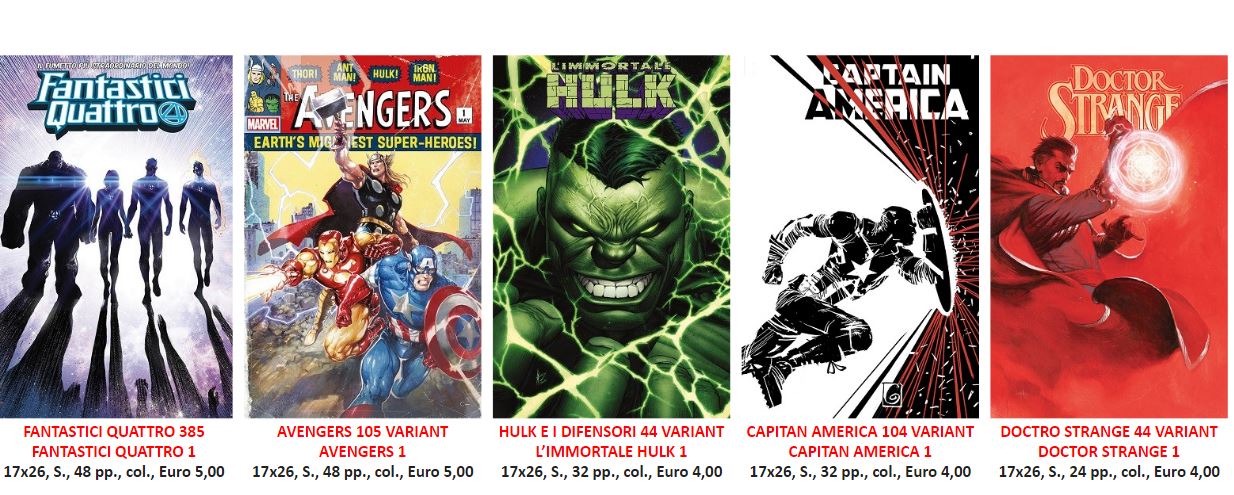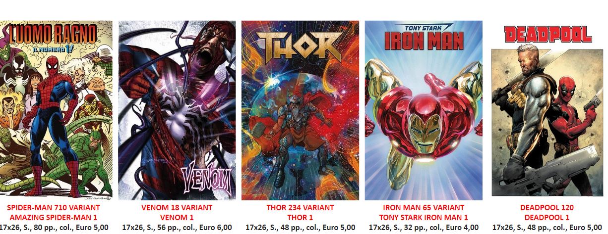Questo rilancio, per noi, vuole essere un ritorno non solo alle origini, ma anche alla qualità e all’ordine della presentazione. Ogni storia, quindi, avrà un formato di destinazione specifico. I primi tre lanci saranno Amazing Spider-Man di Nick Spencer (Captain America, Secret Empire) e Ryan Ottley (Invincible), 80 pagine quindicinali da edicola e fumetteria a € 3,90; Avengers di Jason Aaron (Thor, Star Wars) ed Ed McGuinness (Hulk, Deadpool), 48 pagine mensili da edicola e fumetteria a € 3,50; Tony Stark: Iron Man di Dan Slott (Amazing Spider-Man) e Valerio Schiti (Guardians of the Galaxy), 24 pagine mensili da edicola e fumetteria a € 2,00. Saranno tutti disponibili in edicola l’8 novembre. Essendo novembre il mese del fumetto per eccellenza, saranno presentati in anteprima a Lucca il 31 ottobre, ognuno con una variant esclusiva per la fiera e per il sito paninicomics.it non disponibile in altri canali. Per la prima volta, però, le fumetterie aderenti ai livelli 2, 3 e 4 della promozione avranno con lo stesso anticipo (31/10/2018) i tre albi in edizione regolare, ognuno con una variant esclusiva per la fumetteria che non sarà disponibile in altri canali. In edicola e in fumetteria, nel nuovo formato a 24 pagine con storia singola, ci saranno da novembre anche Thor (Jason Aaron, Mike Del Mundo) e a seguire da dicembre Capitan America (Ta-Nehisi Coates, Leinil Yu). Nel formato a 48 pagine, invece, pubblicheremo da novembre Deadpool (Skottie Young e Nic Klein) e da dicembre la fortunatissima Venom (Donny Cates e Ryan Stegman), che continueranno a grande richiesta la loro corsa quindicinale. Dicembre sarà anche il mese di lancio in questo formato (48 pagine a € 3,50) del più atteso ritorno di sempre in casa Marvel: Fantastici Quattro di Dan Slott e Sara Pichelli. Un evento che sarà epocale, senza esagerazione. Le testate mutanti non saranno toccate inizialmente da questo rilancio